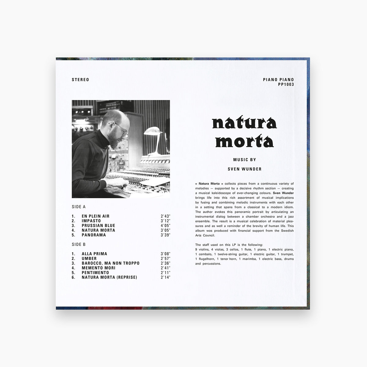 Natura Morta collects pieces from a continuous variety of melodies — supported by a decisive rhythm section — creating a musical kaleidoscope of ever-changing colors. Sven Wunder brings life into this rich assortment of musical implications by fusing and combining melodic instruments with each other in a setting that spans from a classical to a modern idiom. The author evokes this panoramic portrait by articulating an instrumental dialog between a chamber orchestra and a jazz ensemble. The result is a musical celebration of material pleasures that also serves as a reminder of the brevity of human life. This album was produced with financial support from the Swedish Arts Council.